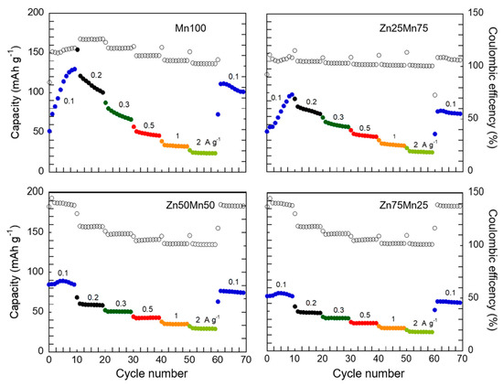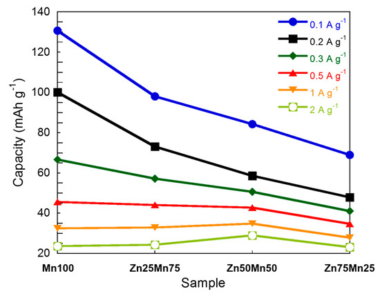 In terms of electrochemical properties, the higher the Mn content is, the higher the capacity values are, as shown in Figure 5. In contrast, at high Mn contents, capacity values decrease significantly by the tenth cycle. For instance, for Mn100 sample capacity retention is 39% (130 mA h g−1 vs. 51 mA h g−1) while for Zn25Mn75 sample this retention is 53% (98 mA h g−1 vs. 52 mA h g−1). For Zn-enriched samples, instead, the capacity retention is much higher: 61% for Zn50Mn50 (64 mA h g−1 vs. 39 mA h g−1) and 94.5% for Zn75Mn25 (73 mA h g−1 vs. 69 mA h g−1). At low current intensities, the active material has enough time to fully charge and discharge, i.e., Zn2+ ions can intercalate and deintercalate into the PBA structure. As the current increases, diffusion processes and even charge transfer processes are hindered and the reaction yield is much lower. On the other hand, the decrease in capacity with increasing zinc content is related to the lack of electroactivity of Zn. The higher the concentration of Zn in the PBA structure, the lower the amount of Mn3+/2+ redox couple, which has a direct impact on the capacity of the compound.