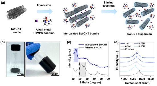 The debundling and individual dispersion of single-walled carbon nanotubes (SWCNTs) is a crucial step for the utilization of SWCNTs as the constituent material in various functional composites [1,2,3,4], templates [5,6,7], and electrically and thermally conductive films [8,9,10,11]. The advantages of SWCNTs, such as a high specific surface area and low percolation threshold [12,13], originate from the exceptionally high aspect ratio [14,15] and can be ideally realized when the SWCNT strands are individually separated prior to being processed into the targeted form. In order to debundle the SWCNTs, the Van der Waals interaction between the SWCNT strands must be overcome. The most common approach is the oxidation of SWCNTs, which can be achieved by treating the SWCNT bundles with chemical oxidants [16,17]. While the oxidation-based approach is effective for individual dispersions and achieving highly concentrated solutions, the degradation of intrinsic properties cannot be avoided. On the other hand, non-oxidative approaches, also adopted in the case of graphene exfoliation and utilization [18,19], utilize surfactants and polymeric dispersants combined with physically induced stresses, which may enable the debundling of SWCNTs without the deformation of the crystallinity. However, the dispersion process, using an intensive energy input, shows trade-off relations in the dispersion concentration and the length of individual SWCNT strands due to low debundling efficiency [20,21]. Moreover, such a process requires the excessive use of surfactants or dispersants, since the maximum concentration of individually dispersed SWCNTs is below 0.1 mg/mL when no surfactants are used [ref]. An alternative approach to effectively disperse SWCNTs is modulating the surface charge density of the SWCNTs to induce electrostatic repulsion between the SWCNT strands. The most widely known strategy is using superacids such as oleum or chlorosulfonic acid (CSA) to induce protonation on the surface of the SWCNTs [22,23]. An SWCNT concentration up to 10 wt% was reported, along with the development liquid-crystalline (LC) phases in accordance with the volume fraction and charge density change in the SWCNTs [23]. While the protonation leads to the positive charging of the SWCNTs, methods for negative charging were also reported [24,25,26]. The methods induce charge donation from alkali metals to the SWCNT bundles, which resemble the formation of graphite intercalation compounds [27]. When the negatively charged SWCNT bundles are exposed to aprotic organic solvents with sufficient polarity, the SWCNTs can be isolated in a facile manner without oxidation. The SWCNT dispersion methods based on the charging mechanism are especially advantageous in preserving the innate crystallinity along with possibility of achieving a high concentration. However, apparent limitations—such as the high corrosiveness of the superacids, the requirements for a low temperature [24,26] or introduction of mediators (i.e., benzene derivatives or crown ethers) [25], and the separately carried out steps for the charging and the dispersion—can lead to an inability or degraded performance when applying the dispersions for hybridization with other materials.