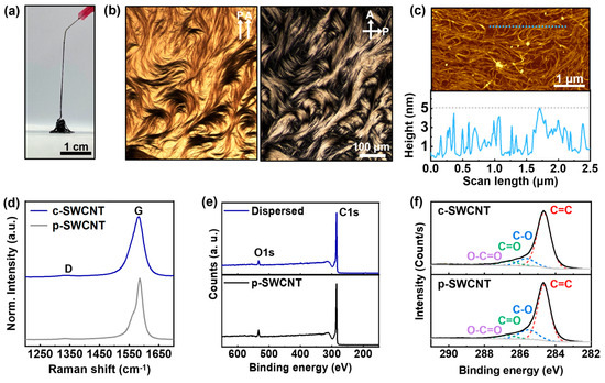 Figure 2a is the digital image of the c-SWCNT dispersion fabricated with an electron solution with a potassium concentration of 1 M. The c-SWCNT dispersion extruded from the nozzle piles up on the substrate, indicating its high viscosity. The increase in viscosity is a typical phenomenon observed in dispersions containing nanomaterials with a high aspect ratio [33], implying that the c-SWCNTs are effectively dispersed in the electron solution. The dispersion state of the c-SWCNTs can be observed by using POM. The POM images of the c-SWCNT dispersion shown in Figure 2b reveal that the dispersed c-SWCNTs exhibit an LC behavior in resemblance to the observations in previous works using superacids [23]. The LC behavior of c-SWCNTs can be achieved only when the SWCNTs can be individually dispersed at a sufficiently high concentration, when no additives are used. The individual dispersions of c-SWCNTs were further confirmed using AFM. Several points with height values around 1.2 nm were detected in the AFM result in Figure 2c, which corresponds to the summation of a single c-SWCNT strand diameter (i.e., 0.9 nm), measured with TEM (Figure S2), and the distance between the SWCNT and the SiO2 substrate [34]. The results indicate that single SWCNT strands can be isolated even at a high concentration, with the maximum diameter of the bundles formed during the sampling process being less than 5 nm. The superb dispersion efficiency also allows for the preservation of crystallinity. The c-SWCNTs require only a mild dispersion process such as magnetic stirring, which limits the generation of defects in contrary to high-energy dispersion techniques such as high-pressure homogenization. The Raman spectra of the c-SWCNT film in Figure 2d show no visible change in the D peak compared to that of the p-SWCNT film, indicating that no defects are formed during the dispersion process. The XPS survey and C1s scan in Figure 2e,f also show that no defect formation and oxidation occur in c-SWCNTs. The oxygen content in the c-SWCNT sample was 3.74 at%, which is slightly less than in the p-SWCNT sample (5.68 at%). The decreased oxygen is possibly due to the strong reducing property of the electron solution, as evidenced by the decreased hydroxyl bond (C-O, 285.6 eV) in c-SWCNTs compared to the p-SWCNTs.
