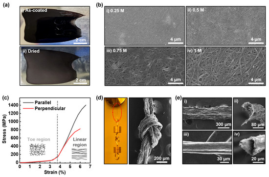 The LC behavior of the c-SWCNT dispersion, combined with the non-corrosive properties of HMPA, allow for its application in a variety of conventional fabrication process used in industries, such as blade coating or wet spinning. Figure 3a shows the digital images of c-SWCNT film fabricated by coating of the c-SWCNT dispersion on an Al foil. The c-SWCNT dispersion exhibits sufficient viscosity and adhesion to form a smooth layer over the foil, the morphology of which is preserved after the drying process. The c-SWCNT film can be easily separated from the foil by simply immersing the sample into DI water. When the sample is immersed, the water molecules diffuse into the interface of the film and the foil, where the K ions remaining inside the c-SWCNT film react with the water to generate hydrogen gas, which form bubbles, leading to the separation of the c-SWCNT film and the Al foil. The Figure 3b shows the surface image of the films fabricated using c-SWCNT dispersions with different K ion concentrations. The analysis reveals that the c-SWCNT dispersion with a higher K ion concentration shows the tendency to form a c-SWCNT film with larger pores and a higher degree of bundling. Such a tendency can be attributed to the different amounts of potassium hydroxide salt formed during the drying process and the hydrogen gas formation reaction occurring within the film, depending on the initial K ion concentration. The average electrical conductivity of the c-SWCNT film reached up to 600,000 S/m (Table 1), the value of which matches the preliminary results achieved in densely packed SWCNT fibers fabricated via LC-phase spinning [23]. A comparative analysis on the electrical conductivity of a membrane film fabricated with p-SWCNTs was shown to be approximately 22,300 S/m (Figure S3). The low electrical conductivity value of the p-SWCNT membrane is possibly the result of an overestimated thickness value due to the existence of thick bundles and the low packing density of the SWCNTs in the membrane. The packing density of the c-SWCNT films should also affect their mechanical strength, since it is dominated by the Van der Waals interaction at the interfaces of the packed c-SWCNTs. Figure 3c is the tensile test result of the c-SWCNT film fabricated with a K-ion concentration of 0.25 M. The stress–strain curve of the c-SWCNT film exhibits two regions showing different types of strain behaviors. The curve shows a linear increase up to a strain of 3% and begins to show an exponential increase until the strain reaches 3.7%. After 3.7%, the curve shows a common shape corresponding to elastic and plastic deformations of a bulk material. The reason for the different mechanical behaviors at different strain regimens is possibly attributed to the network structure of the c-SWCNT film, which resembles the fibrous structure of biological tissues, showing similar tensile behavior [35]. In the first region (i.e., strain < 3.7%), the SWCNTs in the film rearrange to align in the direction of induced tension, relieving the structural stress in the film. After the rearrangement ends, the film shows a bulk-like behavior, which is due to the interfacial bonding between the SWCNTs, possibly relaxed by the slipping phenomenon at a higher strain regimen [36]. It should be noted that the SWCNTs in the film are not completely aligned by the induced tension, as depicted by the different yield strengths between two different tensile directions. When the tension is applied parallel to the direction of c-SWCNT coating, the yield strength reaches 1.4 GPa, while it reaches only 0.8 GPa when the tension is applied perpendicular to the coating direction. The result suggests that the c-SWCNTs are pre-aligned to a certain degree due to the inducement of shear force during the coating process. Using the shear-induced alignment property, the c-SWCNT dispersion can be utilized as a dope for the wet-spinning process to fabricate SWCNT fibers. The SWCNTs are intrinsically hydrophobic, while the HMPA is miscible with water, implying that it is possible to apply a conventional wet-spinning mechanism involving the injection of dope solution into a coagulation bath filled with antisolvent. Figure S4 shows the instrumental configuration for wet-spun c-SWCNT fiber fabrication. When the c-SWCNT dope is injected into the coagulation bath, the HMPA molecules diffuse out of the dope, and the remaining c-SWCNTs aggregate to form fibers. Figure 3d shows the digital image and SEM image of the exemplary c-SWCNT fiber fabricated by using DI water as the coagulant. A single strand of fiber with width of 200 μm showed mechanical robustness sufficient to withstand the weight up to 2 g and to form a knot. The SEM images in Figure 3e are the comparative images of the fibers spun in DI water (Figure 3e(i,ii)) and a mixture of DI water and ethanol (80:20 = v:v) (Figure 3e(iii,iv)). The SEM images show that the surface texture of the spun fiber becomes smoother in the case of the ethanol solution coagulant and that the cross-sectional shape of the spun fiber is more circular compared to that of the fiber spun in DI water. Moreover, the widths of the fibers spun using different coagulants vary significantly due to the differences in the cross-sectional morphology as well as the packing density of the SWCNTs in the fiber. The change in the fiber morphology is due to the change in the diffusion rate of the HMPA molecules, which becomes slower in ethanol compared to water. When the diffusion rate of the solvent is too high, the solute in the dope has an insufficient amount of time to densely pack during the fiber formation, resulting in an increased surface roughness as well as an anisotropic cross-sectional morphology. Further optimization for the spinning conditions will be conducted to increase the packing density of the fiber and relevant properties.