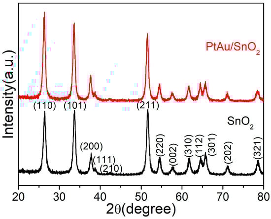 The crystal phases of the pure SnO2 nanospheres and PtAu/SnO2 nanospheres were analyzed by XRD. It is evident from Figure 2 that all the samples displayed intense diffraction signals and displayed Bragg reflections of the SnO2 rutile structure (tetragonal) (110), (101), (200), (111), (210), (211), (220), (002), (310), (112), (301), (202), and (321) planes (JCPDS card no. 41-1445) [25]. No obvious peaks of the metallic NPs (Pt or Au) were found in the PtAu/SnO2 nanospheres sample as the limit of detection was not sufficient for the identifying traces of Au and Pt NPs. On the other hand, the presence of Au and Pt was demonstrated by EDX and XPS (see below). The actual Pt and Au content in the PtAu/SnO2 nanospheres determined by ICP-MS were 1.39 and 0.43 wt%, respectively.