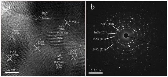 The microstructure of the functionalized PtAu/SnO2 nanospheres was determined by HRTEM. The selected area electron diffraction (SAED) pattern as well as the typical HRTEM lattice image of the PtAu/SnO2 are shown in Figure 4. The HRTEM micrograph displayed in Figure 4a shows that the SnO2 nanospheres were a single crystal structure with interplanar spacings equal to 0.335 and 0.264 nm, as determined from the lattice fringes that corresponded to the (110) and (101) SnO2 rutile structure planes [11]. Furthermore, the characteristic interplanar 0.235 nm spacings correspond to the PtAu (111) planes, suggesting the particle’s structure comprised multiple crystals of both Au and Pt [25,26]. Additionally, the diffraction rings observed in the SAED patterns displayed in Figure 4b were ascribed to the planar directions of (110), (101), (211), and (111), indicating the tetragonal rutile structure of the SnO2 crystallites and PtAu NPs.