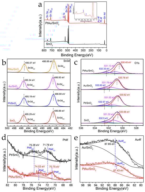 The bonding state and chemical position of the Pt- and Au-loaded SnO2 nanospheres were explored through XPS (Figure 5). The survey spectrums for pristine SnO2 and PtAu/SnO2 are displayed in Figure 5a, confirming the existence of Pt as well as Au in the PtAu/SnO2 nanospheres. The high-resolution (HR) XPS analysis of Sn 3d in the pure SnO2, Pt/SnO2, Au/SnO2, and PtAu/SnO2 samples is presented in Figure 5b. All materials demonstrated two symmetrical signals, with the BE values derived from Sn 3d5/2 and Sn 3d3/2 [11,18]. Compared to pristine SnO2, because of the incorporation of Au and Pt NPs on the nanosphere surface, the Sn 3d band of the Pt/SnO2 and PtAu/SnO2 samples moved towards lower BE values, while the Sn 3d signal of the Au/SnO2 material shifted towards a higher value of BE. The displacement of the Sn 3d signal was because of the interface of SnO2 with the Au as well as Pt NPs, resulting in the change in the electronic structure of the SnO2 surface, thereby enhancing the detecting performance. Figure 5c shows the HR-XPS analysis of O 1s in the pure SnO2, PtAu/SnO2, Au/SnO2, and Pt/SnO2 samples. The O 1s XPS spectrum was resolved into three BE values at 530.45−530.78 eV, 531.12−531.78 eV, and 532.33−532.63 eV, which were associated with lattice oxygen (Olat), defect oxygen (Odef), and adsorbed oxygen (Oads), respectively [10]. It is generally believed that the surface Oads ions would facilitate the adsorption process of gas sensing. It was found that the content of Oads in PtAu/SnO2 was higher than that of pure SnO2, Pt/SnO2, and Au/SnO2, indicating that the loading of PtAu NPs could activate and dissociate O2 in the ambient air and increase the content of Oads, which would participate in the oxidation−reduction reaction, resulting in a larger change in the resistance of PtAu/SnO2. The XPS peaks of Pt 4f were found in the obtained samples of Pt/SnO2 and PtAu/SnO2, as shown in Figure 5d, which were associated with Pt 4f7/2 and Pt 4f5/2. Similarly, the XPS peaks of Au 4f appeared in the obtained samples of Au/SnO2 and PtAu/SnO2, as shown in Figure 5e, which were attributed to Au 4f5/2. Compared to Pt/SnO2 and Au/SnO2, the XPS signals of Pt 4f and Au 4f observed in the PtAu/SnO2 sample both moved towards lower BE values, further indicating the presence of a combined impact because of modification in the electronic structure of the PtAu NPs.