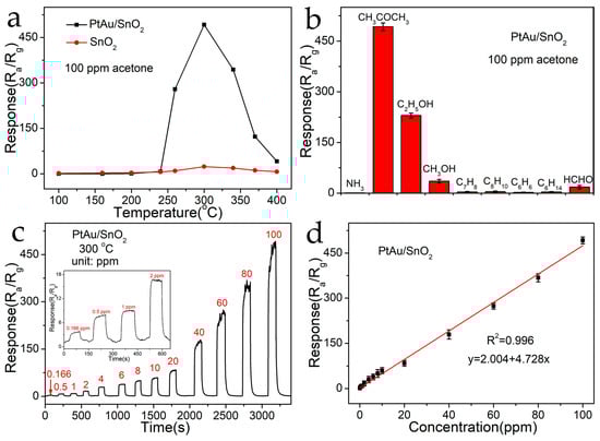 (a) Response of pristine SnO2 sensors and PtAu/SnO2 sensors to 100 ppm acetone at various temperature values. (b) Selectivity test of PtAu/SnO2 sensors against 100 ppm of NH3, CH3COCH3, C2H5OH, CH3OH, C7H8, C8H10, C6H6, C6H14, and HCHO at 300 °C. (c) Dynamic response plots of PtAu/SnO2 materials to varying amounts of acetone (0.166–100 ppm) at 300 °C. (d) Linear response of PtAu/SnO2 sensors with acetone gas concentration.
