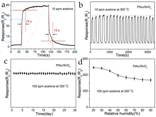 (a) The obtained response as well as recovery times for the PtAu/SnO2 sensors to acetone (10 ppm) at 300 °C. (b) Repeatability of the PtAu/SnO2 sensor to acetone (10 ppm) at 300 °C. (c) The 30-day stability tests of PtAu/SnO2 sensors against acetone (10 ppm) at 300 °C. (d) Response of PtAu/SnO2 sensor across varying relative humidities to acetone (100 ppm) at 300 °C.
