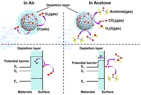 Early diagnosis and screening of chronic diseases are important factors for improving cure rates. Concentration changes of volatile organic compounds (VOCs) in human exhalation are closely linked to certain diseases, and analyzing these VOCs is a non-invasive and convenient method [1]. Among different gas biomarkers, acetone is the key factor reflecting the progress of diabetes and/or therapeutic effect, and its concentration can be used as the basis to diagnose diabetes [2]. Therefore, the rapid and effective detection of acetone is highly desirable. According to clinical analyses, the level of acetone exhaled by healthy people is 300–900 ppb, whereas its level exhaled by diabetic patients exceeds 1.8 ppm [3,4]. Faced with extremely low target gas (TG) concentrations and complex background environments, stricter requirements are required to construct high-performance gas sensors, enabling the recognition of acetone in breath at ppb levels with improved selectivity. Chemiresistive-gas-sensor-based non-invasive respiratory diagnoses have become a promising technique for portable disease screening compared to other respiratory component detection technologies due to their superior sensitivity, good material designability, low cost, compact size, easy integration into sensor arrays, and low power consumption [5,6].