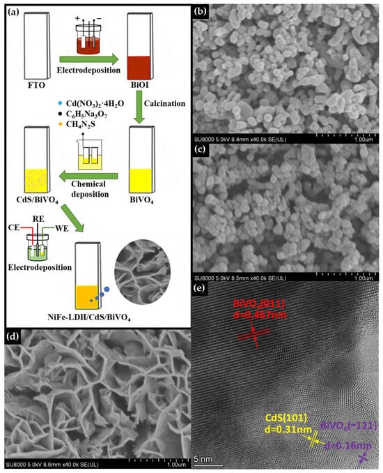 (a) The synthetic procedure of the NiFe-LDH/CdS/BiVO4 photoanode; SEM images of (b) BiVO4, (c) CdS/BiVO4, and (d) NiFe-LDH/CdS/BiVO4; (e) HRSEM image of NiFe-LDH/CdS/BiVO4.