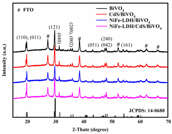 The crystal phase and structure of the photoanode materials were examined using X-ray diffraction (XRD), with results presented in Figure 2. In addition to the distinct diffraction peaks corresponding to SnO2 from the FTO substrate, the XRD spectrum of the as-prepared BiVO4 aligns well with the monoclinic scheelite BiVO4 (JCPDS: 14-0688). However, no characteristic diffraction peaks for CdS and NiFe-LDH were observed in the XRD spectra of the modified photoanodes. This absence is likely due to the low loading of CdS and the amorphous nature of NiFe-LDH, as corroborated by SEM and HRTEM results. The amorphous structure of the NiFe-LDH nanosheets may introduce abundant defects or vacancies, thereby increasing the active sites on the catalyst surface and facilitating the oxygen evolution reaction (OER) [46].