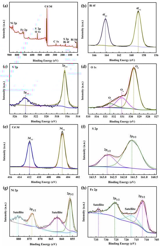 XPS spectra of (a) NiFe-LDH/CdS/BiVO4, (b) Bi 4f, (c) V 2p, (d) O 1s, (e) Cd 3d, (f) S 2p, (g) Ni 2p, and (h) Fe 2p.