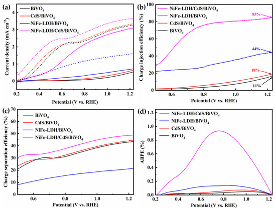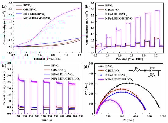 The PEC performances of the photoanodes were evaluated by measuring the photocurrent density versus applied potential curves under AM 1.5 G solar illumination from a xenon lamp in a 0.5 M Na2SO4 electrolyte at pH 6.1. As demonstrated in Figure 4a, at 1.23 V, the photocurrent density of bare BiVO4 is 0.53 mA cm−2. In comparison, the CdS/BiVO4 and NiFe-LDH/BiVO4 photoanodes yield marginally higher values, attaining 0.63 mA cm−2 and 0.71 mA cm−2, respectively. Strikingly, the NiFe-LDH/CdS/BiVO4 photoanode delivers a photocurrent density of 3.1 mA cm−2, surpassing CdS/BiVO4 by 4.9-fold, NiFe-LDH/BiVO4 by 4.3-fold, and bare BiVO4 by 5.8-fold. Moreover, the onset potentials for CdS/BiVO4, NiFe-LDH/BiVO4, and NiFe-LDH/CdS/BiVO4 photoanodes exhibit cathodic shifts of 140 mV, 430 mV, and 540 mV, respectively, relative to BiVO4. These findings imply that a single-component modification of BiVO4 only with CdS or NiFe-LDH is barely adequate to improve the PEC performance. However, a significant enhancement of PEC performance could be achieved through dual modification with CdS and NiFe-LDH. The light/dark photocurrent response, depicted in Figure 4b, confirms the excellent optical switching behavior and high visible light sensitivity of all photoanodes. Among them, the NiFe-LDH/CdS/BiVO4 photoanode demonstrates the most pronounced photoresponse across the entire voltage range. Additionally, the current densities of the photoanodes display minimal decay, eventually stabilizing, as shown in Figure 4c, indicative of their good stability throughout the chronoamperometric tests.