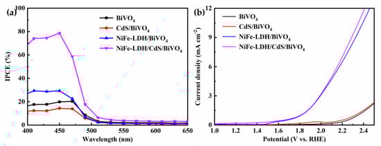 The photoconversion efficiencies of the photoanodes were evaluated by the applied bias photon-to-current conversion efficiency (ABPE), calculated from the J − V curves according to Equation (3). As revealed in Figure 4d, the NiFe-LDH/CdS/BiVO4 photoanode possesses the highest ABPE of 0.93% at a lower potential (0.75 V), a significant improvement compared to BiVO4 (0.048% at 1.01 V), CdS/BiVO4 (0.073% at 0.96 V), and NiFe-LDH/BiVO4 (0.14% at 0.83 V). The incident photon-to-current efficiency (IPCE), another important index for evaluating photoconversion efficiencies, was further examined. The NiFe-LDH/CdS/BiVO4 photoanode achieved a superior IPCE of 78.6% at 450 nm, outperforming BiVO4 (20.3%), CdS/BiVO4 (14.3%), and NiFe-LDH/BiVO4 (29.3%) (Figure 6a).