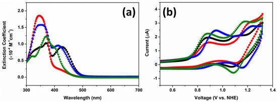 Additionally, the π-conjugation length is significantly influenced by the structural factor between the donor and the π-bridge. For example, the E0-0 values follow the order of 4-phenylbenzothiophene (E0-0 = 2.61 eV) = naphthodithiophene (E0-0 = 2.61 eV) < 6-phenylbenzothiophene (E0-0 = 2.44 eV) < 9,9-dimethyl-florene (E0-0 = 2.43 eV). To assess the electrochemical properties depicted in Figure 1b, cyclic voltammetry measurements were conducted on four kinds of synthesized organic photosensitizers in a THF solvent environment. A 0.1 M concentration of tetrabutylammonium tetrafluoroborate was added as a supporting electrolyte. Using a CHI 600C electrochemical analyzer, Pt wires were employed as both the working and counter-electrodes, while an Ag wire served as the pseudo-reference electrode. The voltage sweep rate was set at 50 mV/s. Oxidation potentials (Eox vs. NHE) were calculated by adding 0.63 V to the oxidation potential of ferrocene (Eox = 0.81 V vs. Ag/Ag+) [45]. The first oxidation potential (Eox1), indicative of the HOMO energy levels in the four kinds of organic sensitizers, was observed within the potential range of 0.81 to 0.87 V, as shown in Table 1. The appearance of the initial oxidation hump is closely related to the oxidation of the 4-(bis(9,9-dimethyl-9H-fluoren-2-yl)amino terminal [46]. Interestingly, the impact of individual π-bridge structures was evident from the potential values of the secondary oxidation (Eox2) in the potential range of 1.09 to 1.20 V. Remarkably, π-bridge structures play a more vital role in determining LUMO levels than they do in HOMO levels. This observation suggests that each organic dye possesses sufficiently higher ELUMO to maintain the minimum energy difference of 0.4 eV in relation to TiO2 (−0.28 V vs. NHE) of the conduction band potential (Ecb). This difference is essential for efficient electron injection from a sensitizer to the conduction band of TiO2. Considering that all oxidation potentials are more positive than the iodide/triiodide couple (0.4 V vs. NHE), favorable dye regeneration kinetics can be anticipated. Considering that LUMO energy levels and E0-0* values were approximated by the energy difference between Eox1 and E0-0, the E0-0* values ranged from −1.57 to −1.80 V versus NHE. Consequently, efficient electron injection from the photoexcited sensitizer to the TiO2 conduction band (−0.4 V vs. NHE) is expected. These empirical findings demonstrate that both the HOMO and LUMO energy levels are well aligned for effective charge separation and dye regeneration.
