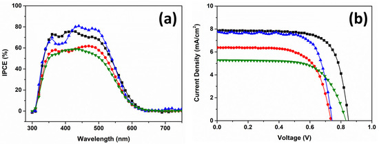 Dye-sensitized solar cells were fabricated following the described procedures, and their photovoltaic performances were measured under an AM 1.5 global one sun light intensity of 100 mW/cm2. The incident photon-to-current conversion efficiencies (IPCEs) of the four organic photosensitizers were plotted as a function of the incident wavelength, as shown in Figure 3a. The maximum IPCE values for each sensitizer were observed in the range of 55 to 82%. The onset wavelengths were recorded between 620 nm and 624 nm, following the order of shPS > cPS > loPS > tPS. The light absorption range of tPS is broader than that of loPS due to its bulky structure, resulting in a smaller amount of adsorbed tPS on the TiO2 surface compared to loPS. Consequently, the IPCE value of tPS was the lowest among the four organic sensitizers. Upon comparing the IPCE spectra and the UV-vis spectra, all organic PSs exhibited a red-shift of approximately 100 nm [45]. This tendency extends the light absorption range by nearly 100 nm. Notably, shPS and cPS, with linear π-bridge structures, demonstrate high photon-to-current conversion efficiencies exceeding 70% due to their effective conjugation.