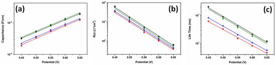 EIS fitting parameters of solar cells employing suggested metal-free organic photosensitizers, shPS (black), loPS (red), cPS (blue), and tPS (green). Chemical capacitance (a), recombination resistance (b), and electron lifetime (c).