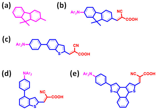 Chemical structures of newly developed metal-free organic photosensitizers: (a) pristine Ar as a donor group (pink color), (b) shorter linear (shPS), (c) longer linear (loPS), (d) c-shaped (cPS), and (e) t-shaped (tPS). Blue color—ligand; red color—anchor group as acceptor.