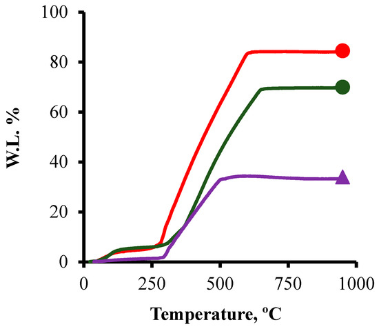 The textural characterization was obtained by using Autosorb equipment from Quantachrome system (Boynton Beach, FL, USA). N2 adsorption isotherm at −196 °C and CO2 at 0 °C were obtained. The B.E.T. and Dubinin–Radushkevich (DR) methods were applied to the nitrogen and carbon dioxide isotherms, respectively, to obtain the apparent surface area, total micropore volume (W0 with N2), narrow micropore volume (W0 with CO2), and mean micropore width (L0) [46,47,48]. The pore-size distribution (PSD) was determined by applying Quenched Solid Density Functional Theory (QSDFT) to the N2 adsorption isotherms, assuming slit-shaped pores.