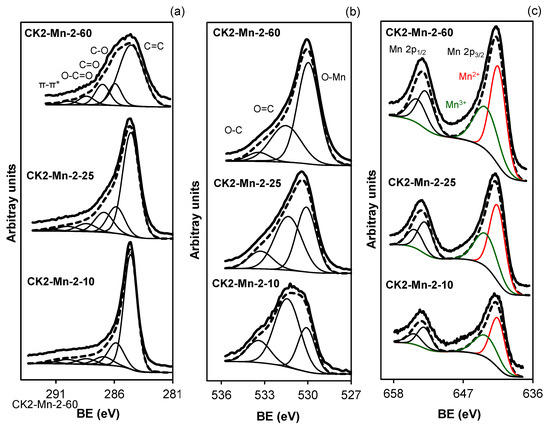 Figure 5 and Figure 6 show the XPS spectra for the signals C1s, O1S, and Mn2p. The surface composition of the samples was determined from the deconvolution of the XPS spectra, and the results are summarized in Table S1 (Supplementary Materials). The peaks obtained from the deconvolution of the C1s spectrum were related to C=C (284.6 eV), C-O (285.7 eV), C=O (287 eV), O-C=O (288.4 eV), CO2 or π-π* bonds and plasmon (290 and 291.6 eV) [63,64,65,66,67]. The peaks from O1s, were deconvoluted in O-Mn (530.0 eV), O=C (531.4 eV), and O-C (533.4 eV) [68,69]. From Mn2p the peaks detected were Mn2+ (641.6 eV) and Mn3+ (643.4 eV) [70,71,72,73,74].
