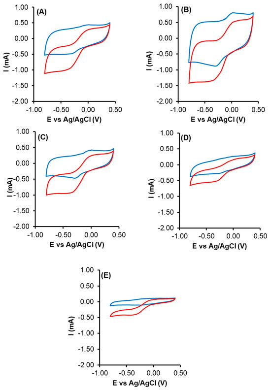 CV of (A) CK2-Mn-1-10, (B) CK2-Mn-2-10, (C) CK2-Mn-3-10, (D) CK2-Mn-2-25, (E) CK2-Mn-2-60 in N2 (blue) and O2 (red).