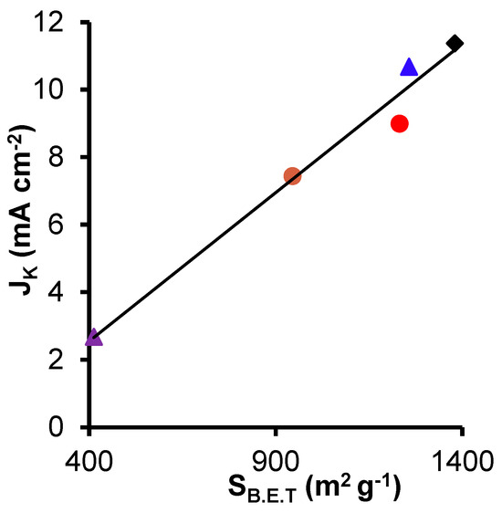 Figure 8 and Figure 9 show the correlation between Jk and the Mn3+/Mn2+ amount and SB.E.T., respectively. The correlation coefficient of R2 was closer to 1 in SB.E.T. (0.98) than with Mn3+/Mn2+ amount (0.94), indicating that although the manganese can be an active site for the ORR, the current density is affected principally for the SB.E.T. [77]. In this case, we can say that physical activation gives as a result a higher surface area that is traduced in a better JK, which is an important parameter for the different electrochemical applications.