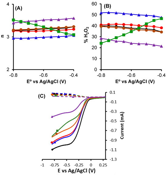 The activity for ORR was studied using the RRDE technique by using an Autolab electrochemical system, Metrohm (Utrech, Holland), associated with a compact potentiostat/galvanostat (PGSTAT101). Electrochemical measurements were carried out in a standard three-electrode electrochemical cell at room temperature. Using a Pt sheet as a counter electrode and an Ag/AgCl reference electrode. The electrolyte was a solution of KOH 0.1 M prepared in deionized water. Before each electrochemical measurement, the electrolyte was saturated with N2 or O2 by purging the necessary gas into the KOH 0.1 M solution at room temperature for 30 min. Cyclic voltammetry (CV) was collected in the KOH 0.1 M solution saturated with N2 or O2 in a range of 0.40 to −0.80 V at 50 mV s−1 with the electrode at a rotational speed of 1000 rpm. Linear scanning voltammetry (LSV) for the ORR was carried out with a potential range between 0.40 V and −0.80 at 50 mV s−1 with the electrode at rotational speeds of 500, 1000, 1500, 2000, 2500, 3000, and 3500 rpm.