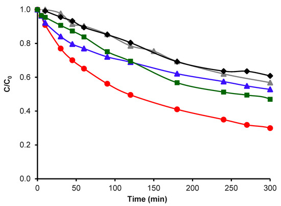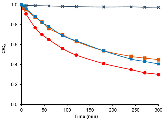 Advanced oxidation processes (AOPs) are a highly regarded option for reducing various persistent pollutants in water due to the generation of hydroxyl radicals (·OH) that have a high oxidative capacity (2.8 V vs. RH) capable of partially or completely mineralizing a broad range of pollutants. These radicals are produced on-site when using AOPs, which provides a powerful, alternative method for eliminating persistent pollutants in water [10,11,12]. The electro-Fenton (EF) process is a notable AOP due to its high rate of electro-generated H2O2, low production of iron sludge, and environmentally friendly nature [13]. In general, the EF process is based on the in situ production of H2O2 from the oxygen reduction reaction via two electrons (ORR 2e-) (Equation (1)) at the cathode, generation of ·OH by reacting the Fenton-like catalyst (usually Fe2+) with H2O2 (Equation (2)), and, finally, regeneration of Fe2+ in the cathode (Equation (3)) and by interaction with H2O2 (Equation (4)) [14,15,16,17].