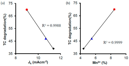 In fact, it seems that a relationship between the Mn2+ values and tetracycline degradation occurs: CK2-Mn-1-10 (8.42 Mn2+; 70% TC removal), CK2-Mn-3-10 (5.48 Mn2+; 47% TC removal), and CK2-Mn-2-10 (4.40Mn2+; 39% TC removal) (Figure 13). The relevance of Mn2+ can be explained by the interaction between Mn2+ and H2O2, which can generate ·OH radicals (Fenton traditional), and by the possible direct generation of ·OH radicals (ORR 3e− proposed) with Mn3+, which is proposed as active site for this route. We propose that a good relationship between the Mn2+ percentage and the surface area is key in the catalytic activity for degrading the tetracycline. So, we can conclude that the tetracycline degradation depends on Jk, which depends on the surface area and the percentage of manganese, which interacts with H2O2, generating ·OH radicals.