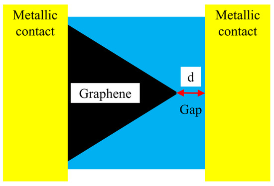 Recently, it was discovered that the tunneling current is enhanced in geometric graphene diodes through a nanosized gap that is placed laterally near a metallic contact, as it is shown in Figure 2 [39]. It is a lateral tunneling metal-insulator-metal (MIM) diode, where the insulator (or dielectric) is air. In this way, this lateral tunneling graphene diode can be elevated as a nanoscale air channel device [40]. The electric field is significantly enhanced at the sharp tip of graphene [41], and thus, the tunneling efficiency is increased by reducing the barrier height due to the confinement of the electric field. Since the gap has a width of 50 nm in [39], and of 20 and 30 nm in [41], the tunneling time is very short, i.e., around 10–20 fs, which translates into a cutoff frequency of tens of THz. These results make lateral tunneling MIM diodes the fastest to date and open the possibility of harvesting the mid-infrared (mid-IR) spectrum or, in other words, to convert mid-IR radiation into a DC signal, thus realizing solar cells working day and night [42]. The latter possibility stems from the big portion of IR power that is emitted by the sun but is unavoidably lost by conventional solar cells.