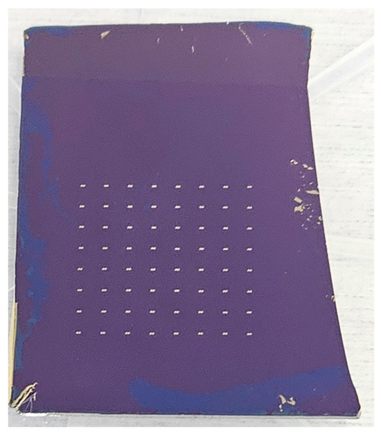 The quantum graphene diodes were fabricated on a doped Si/SiO2 4-inch wafer. The thickness of the Si wafer is 525 µm, while the thermally grown SiO2 has a thickness of 300 nm. The graphene monolayer was grown by means of a chemical vapor deposition (CVD) process and then transferred on the Si/SiO2 substrate by Graphenea (San Sebastian, Spain). Raman spectroscopy has shown that almost 80% of the wafer’s surface was covered with a graphene monolayer, the rest being areas with graphene multilayers containing 4–6 monolayers and grain boundary defects. The fabrication consists in the following steps: (i) patterning the graphene channel by electron-beam lithography (EBL) and reactive ion etching (RIE); (ii) patterning the shapes of the quantum graphene diodes using EBL; and (iii) the patterning, metallization, and liftoff of the Cr (5 nm)/Au (240 nm) metallic contacts deposited using an e-beam process. We fabricated two identical graphene chips cut from the wafer, and the optical image of a chip is presented in Figure 3. In total, we fabricated 128 quantum diodes, 64 for each chip in two fabrication runs.