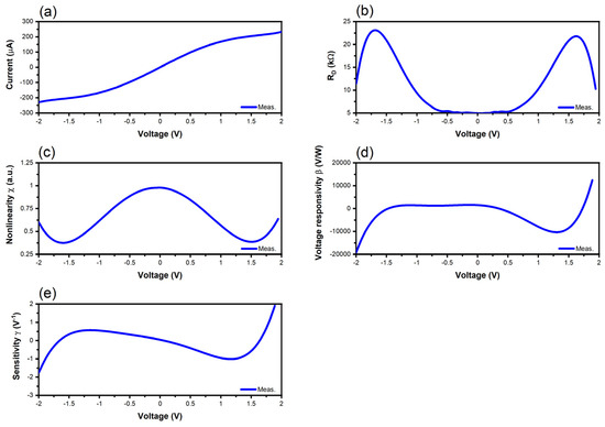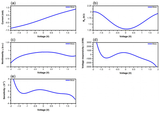 Measured and extracted performance of the trapezoidal graphene diode: (a) I-V curve; (b) differential resistance; (c) nonlinearity; (d) voltage responsivity; (e) sensitivity.