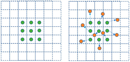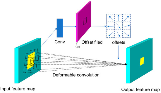 An offset for each sampling point is introduced into deformable convolution in the convolution kernel, which allows adaptive sampling beyond the constraints of a regular grid. The structure of the deformable convolution layer is shown in Figure 1. And a comparison between deformable and standard convolution is shown in Figure 2. The deformable convolution layer in the model has two tasks: first, to use convolution to obtain offset values from the input feature map, and second, to derive the output feature map based on the input feature map and the obtained offsets [31]. The representation of the deformable convolution is given by: