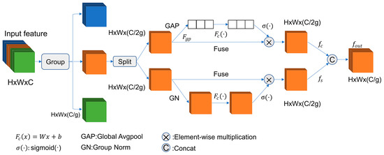 where is the input tensor, represents the mean of channels within each group, and denotes the variance of channels within each group, denotes the set of channels within the group. The scaling coefficient and the offset coefficient , obtained during training, are applied. The constant ϵ is introduced to prevent division by zero errors in the division operation. and , respectively, represent the height and width of the input tensor, and denotes the channel value at position within the g-th group.