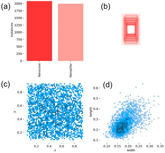 The NanoData dataset utilized in this study comprises two annotated object classes: nanopillars and nanocones. As depicted in Figure 9, the pertinent information pertaining to the manually annotated objects within this dataset is illustrated. The subfigures in Figure 8 are presented in order from left to right and top to bottom. Figure 9a depicts the number of objects in each category in the dataset. Figure 9b depicts the size of the object enclosure boxes in the dataset, with the center coordinates of all the object enclosure boxes fixed at a single point. Figure 9c illustrates the distribution of the center coordinates of the object enclosure boxes. Figure 9d illustrates a scatter plot of the corresponding widths and heights of the object enclosure boxes.