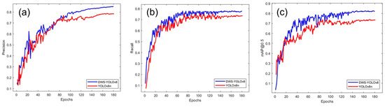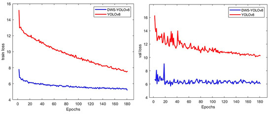 As illustrated in Figure 11, as the number of iterations increases, the average value of the loss function decreases significantly. The loss function of DWS-YOLOv8 accelerates convergence and improves prediction accuracy, and the average value of the loss function tends to converge as the number of trainings approaches 180.
