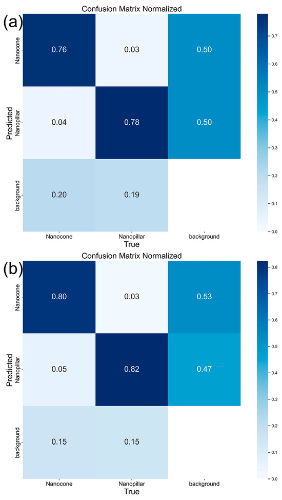 To visualize the performance of the DWS-YOLOv8 model on the dataset, this research generates confusion matrices for both YOLOv8n and DWS-YOLOv8 to compare the target detection performance of the two models on diamond nanostructures, as shown in Figure 12. The rows and columns of the confusion matrix represent the actual and predicted categories, respectively. There are two categories in the dataset: nanocone and nanopillar. The diagonal values represent the percentage of correct predictions for each category, while the values in other areas indicate the proportion of incorrectly predicted categories.