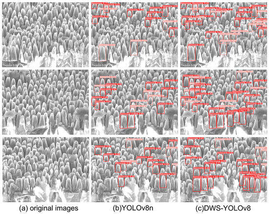 To visually demonstrate the detection performance of this model, this study conducts inference experiments using YOLOv8n and DWS-YOLOv8. This research selects three SEM images containing most of the diamond nanostructures outside the dataset, which include a large number of diamond nanostructures. The visualization results of target detection on the test set for YOLOv8n and the improved YOLOv8 model are shown in Figure 13.