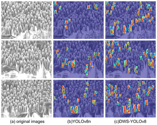 Gradient-weighted Class Activation Mapping (Grade CAM) is used to generate heatmaps for YOLOv8n and DWS-YOLOv8. Heatmaps intuitively and conveniently reflect which areas of the feature maps where the model is focusing on. Grade CAM propagates the model’s gradient information backward to the last convolutional layer and then combines it with the weights of the feature maps to generate spatial region features related to the model’s decisions. Pixels with higher gradients in the heatmap are represented by red shading, while the ones with lower gradients are represented by blue shading. The experimental results are shown in Figure 15.