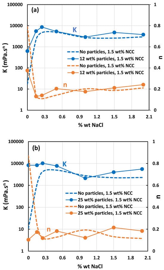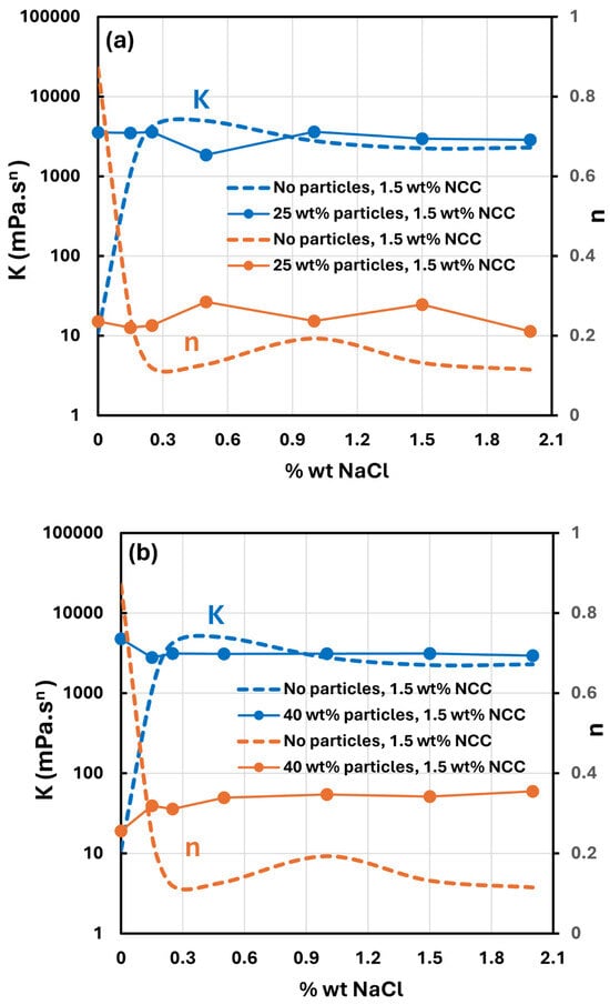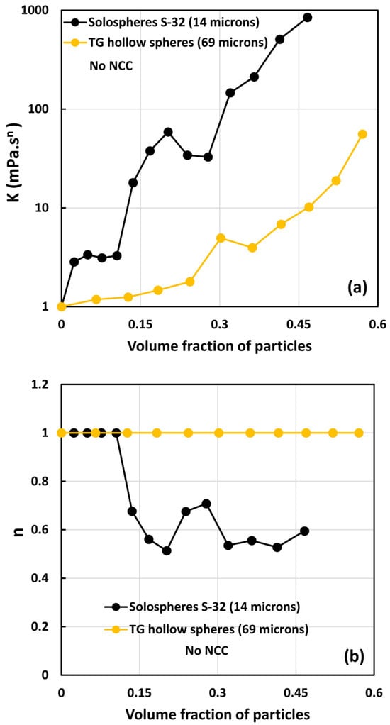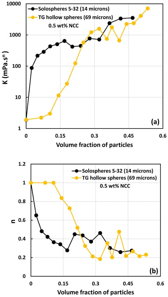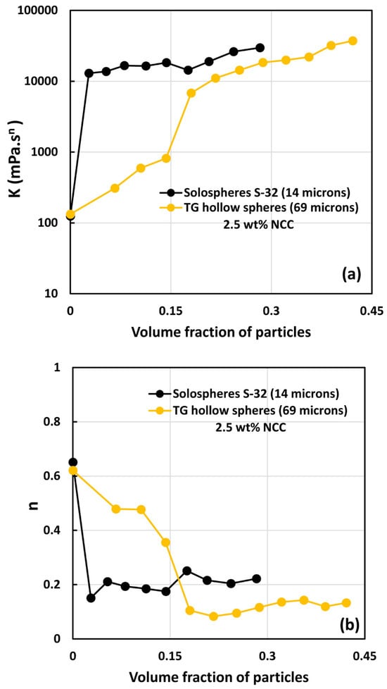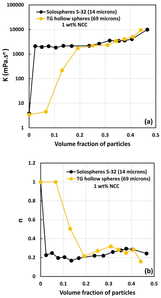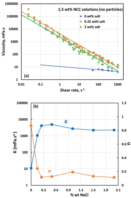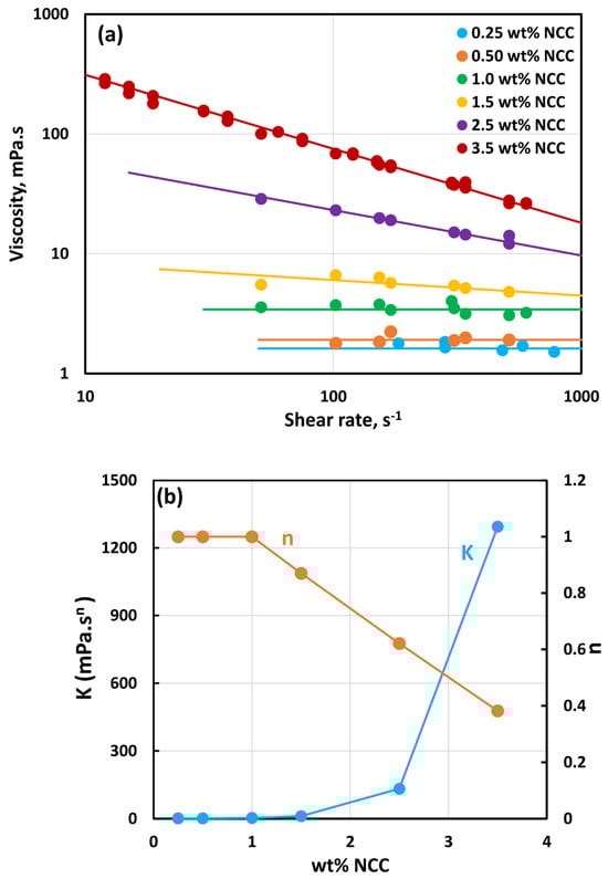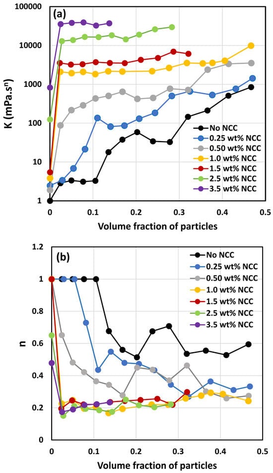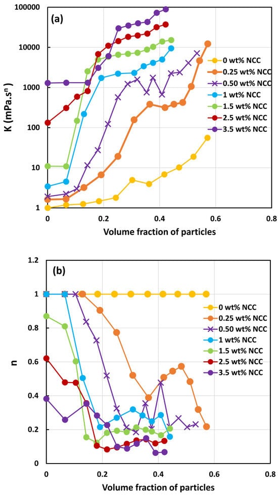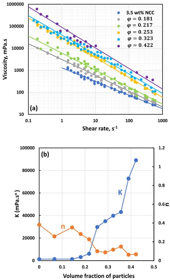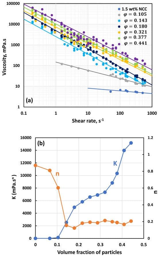 - All suspensions at different particle volume fractions and different NCC concentrations follow power-law behavior (see Equations (2) and (3)). The plots of viscosity versus shear rate are linear on a log–log scale.