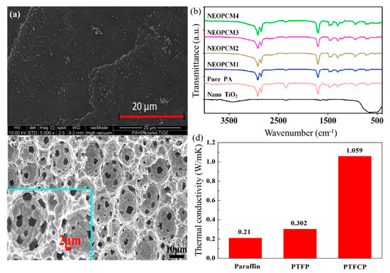 (a) FESEM image of nano TiO2-modified PCMs, (b) FT-IR spectra of nano TiO2-modified PCMs [55], (c) SEM image of nano TiO2 particle foam with carbon shell, and (d) thermal conductivities of the composite PCMs [56]. Reprinted/adapted with permission from Ref. [55]. Copyright 2016 Elsevier. Reprinted/adapted with permission from Ref. [56]. Copyright 2016 Elsevier.