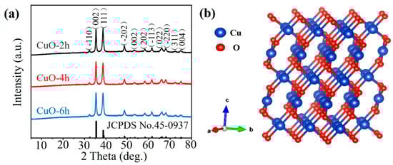 (a) XRD curves of the CuO-2h, CuO-4h, and CuO-6h samples. (b) A schematic of the crystal structure of CuO.
