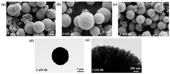 SEM photographs of (a) CuO-2h, (b) CuO-4h, and (c) CuO-6h. (d,e) TEM photographs of the CuO-4h sample.