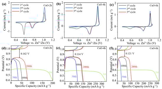 CV curves of the CuO-2h//Zn, CuO-4h//Zn, and CuO-6h//Zn cells are shown in Figure 4a–c, respectively. The CuO-2h electrode shows a reduction peak at 0.58 V and an oxidation peak at 1.0 V during the first scanning process. The peak at 0.58 V fades away at the second cycle and a new set of peaks emerges at 1.02 V/0.76 V. For the CuO-4h electrode, two reduction peaks at 0.57 V and 0.85 V appear in the first cathodic process and an oxidation peak at 1.0 V appears during the subsequent anodic scan. During the second and third cycles, the reduction peak at 0.57 V disappears, the peak at 0.85 V is enhanced, and the intensity of the oxidation peak at 1.0 V is almost unchanged. The shape and variation of the CV curves of the CuO-6h electrode are similar to those of the CuO-4h electrode, but the intensity of the current density peak is relatively small. The changes in the CV curves of the materials indicate that a structure transition of the electrode materials may have occurred at the end of the first discharge. The overlap of the CV curves after the initial cycle suggests that the CuO-2h, CuO-4h, and CuO-6h electrodes exhibit good reversibility after the initial cycle. The charge/discharge profiles of the electrodes at the 1st, 50th, 100th, and 200th cycles are illustrated in Figure 4d–f. The voltage plateau of the battery for the first discharge is about 0.6 V, which is in agreement with the CV analyses. After about 100 cycles, the discharge voltage plateau of the battery gradually stabilizes at about 0.85 V. The discharge capacities of the CuO-2h//Zn battery for the 1st, 50th, 100th, and 200th cycles are 200.1, 34.6, 52.7, and 79.8 mA h g−1, respectively. The capacity is relatively low and decreases quickly. The polarization voltage at the 200th cycle is 0.162 V. The discharge capacities of the CuO-6h//Zn battery at the same cycles are 317.5, 31.5, 81.6, and 109.6 mA h g−1, respectively, and the initial capacity is higher; the polarization voltage is 0.121 V. The CuO-4h//Zn battery’s discharge capacities at the 1st, 50th, 100th, and 200th cycles are 332.2, 106.4, 149, and 153.1 mA h g−1, respectively, and the cell has the highest capacity and the lowest polarization voltage of 0.114 V compared with the other two batteries.