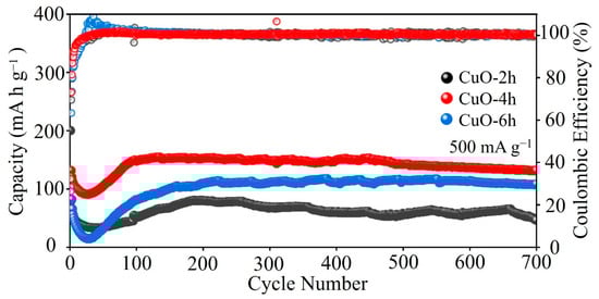 Cycling performance of the CuO-2h, CuO-4h, and CuO-6h electrodes at 500 mA g−1.