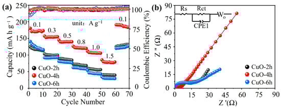 (a) Rate performance and (b) Nyquist plots of the CuO-2h, CuO-4h, and CuO-6h electrodes.
