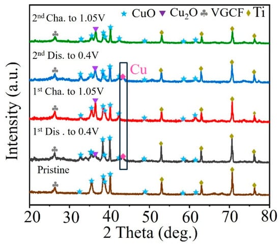 To identify the structural evolution of CuO during the charge/discharge process, ex situ XRD was performed on the CuO electrode (Figure 7). The XRD pattern of the pristine electrode is identical to that of the synthesized CuO-4h powder, except for the diffraction peaks of the Ti metal current collector and the conductive additive (VGCF). At the first discharge to 0.4 V, the diffraction peaks of CuO are noticeably weakened, and two new diffraction peaks appear at 36.3° and 43° at the same time. The diffraction peak at 36.3° corresponds to the (111) crystalline facet peak of Cu2O (purple inverted triangular markers), and the diffraction peak at 43° corresponds to the (111) crystalline facet peak of Cu (pink inverted triangular markers). This indicates that with the embedding of Zn2+, the CuO electrode undergoes a conversion reaction to produce Cu2O and Cu during the discharge process. When charging to 1.05 V, the diffraction peak of Cu disappears completely, and the intensity of the diffraction peaks of CuO remains almost unchanged, but the peaks of Cu2O are significantly enhanced. This suggests that the conversion reaction that occurs during the first charging and discharging process is not completely reversible. Some CuO is reduced to Cu2O and Cu during the first discharging process, and Cu is oxidized to Cu2O instead of CuO during the subsequent charging process. This result explains the lower Coulombic efficiency of CuO at the initial cycle. The XRD curves during the second cycle at discharging to 0.4 V and charging to 1.05 V show a similar change rule to that of the first cycle, which suggests that the active material involved in the electrochemical reaction during the subsequent electrochemical process is mainly Cu2O.