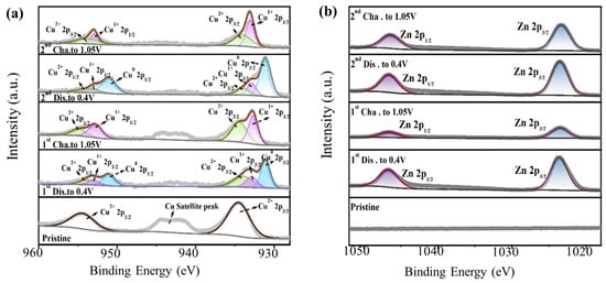 Ex situ XPS spectra of (a) Cu and (b) Zn during the first two cycles.