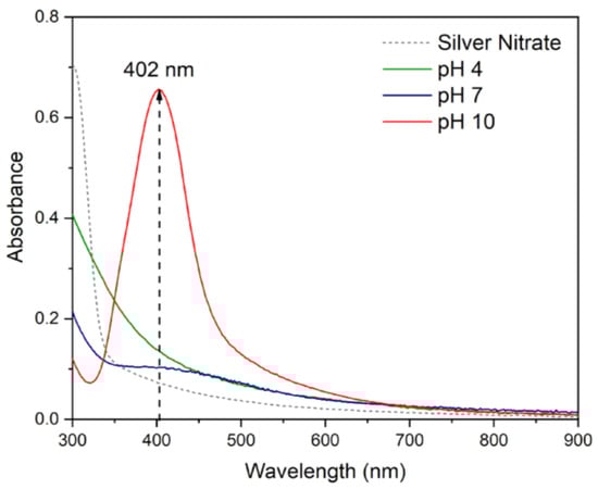 AgNPs in a colloidal system exhibit a surface plasmon resonance (SPR) absorption peak located between 390 and 450 nm using UV-visible spectroscopy analysis. This characteristic is commonly used to confirm the formation of AgNPs [,]. Figure 3 shows the UV–visible spectrum of 1mM AgNO3 and AgNPs synthesized at different pHs.