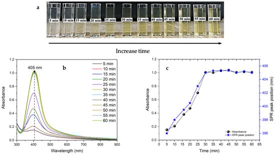 Figure 4a shows the progression of the kinetic reaction over time, where an observable increase in the intensity of the yellow coloration corresponds to the continuous formation of AgNPs. This kinetic response is further supported by the UV-visible spectra presented in Figure 4b. Initially, there is a notable increase in absorbance within the first 30 min, indicative of the rapid nucleation and growth of AgNPs, followed by a stabilization phase. Figure 4c indicates the position of the SPR peak, which goes from 396 nm at 5 min to 405 nm at 30 min. This shift of the SPR peak is associated with the agglomeration of the silver nuclei being stabilized at 30 min. As a result, 30 min was chosen as the optimal reaction time for the complete formation of AgNPs.