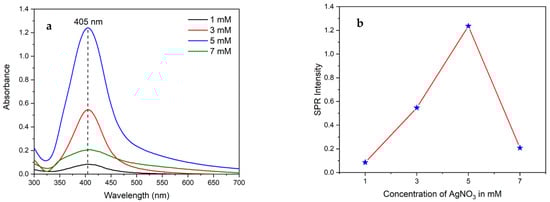 Figure 5a shows UV-visible spectra at different concentrations of AgNO3. Absorption maxima at 405 nm revealed a controlled shape and size of synthesized nanoparticles. When the concentration of silver nitrate increased, the position of the maximum absorption peak did not show a shift. However, the maximum absorbance of the spectrum increased, which is an indication of the formation of more AgNPs with similar size and shape. Based on these results, a 5 mM AgNO3 solution is found to be optimum to produce uniformly sized AgNPs, as shown in Figure 5b.