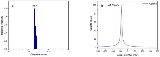 (a) Dynamic light scattering (DLS) and (b) zeta potential distribution of AgNPs.