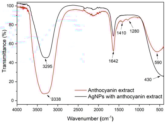 FTIR spectra of the anthocyanin extract and the AgNPs with anthocyanin extract.